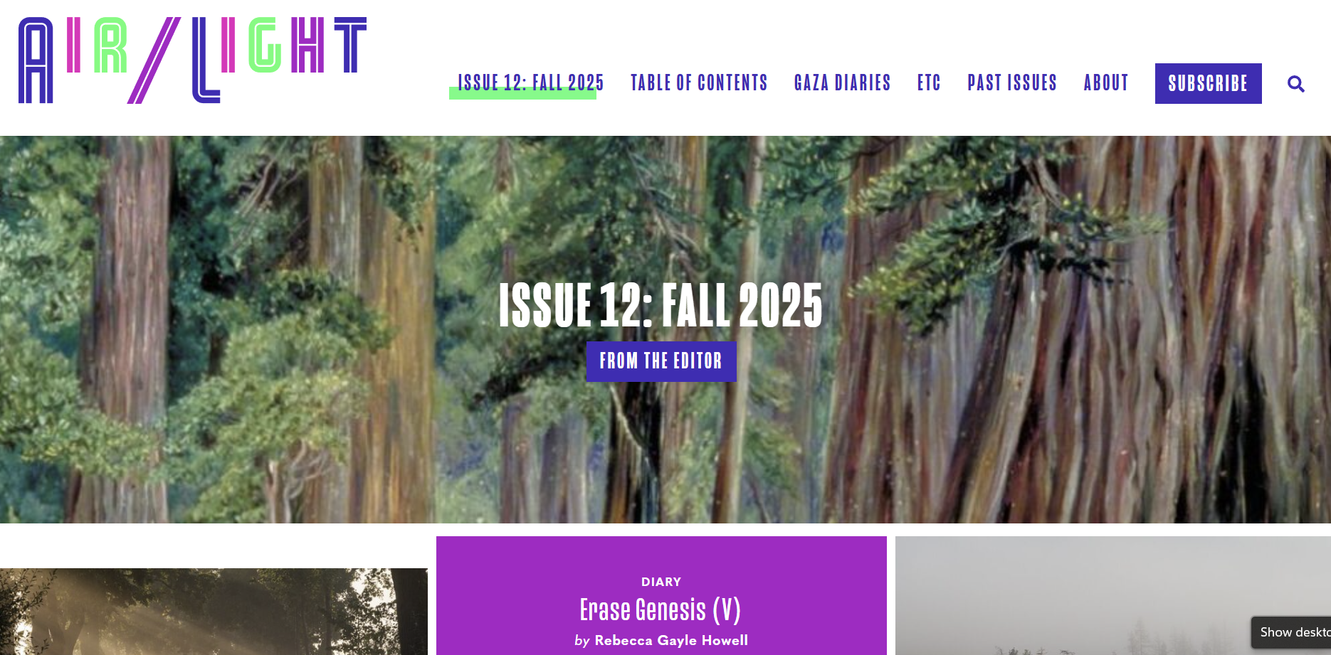 Air/Light is an online literary journal published by the English Department at the University of Southern California. We showcase both traditional and innovative works. We are firmly of the West Coast, but also national, international. We mean to look out expansively from this place rather than to gaze narrowly back at it, to express a West Coast aesthetic, a West Coast sensibility, and direct that lens onto the world. Our intention is to be an artist’s journal—a place where poets and essayists and fiction writers and multimedia creators can all bring work that doesn’t fit inside boxes, that pushes boundaries, that speaks directly to some essential question or concern. A place where artists can experiment, or choose, willfully, not to experiment. A place where they can publish defining work alongside other artists pursuing the same. Our name is inspired by Lawrence Weschler’s 1998 essay “L.A. Glows,” which describes a meteorological condition endemic to Southern California, where the air is full of oversized particles—responsible for the clarity of the light (in the sense that these particles reflect and amplify its glow) and also for optical effects that are obscuring, even mysterious. This phenomenon is known as “airlight,” and it seems an ideal metaphor for what this Air/Light aspires to do: to walk a line between clarity and a kind of focused blurring, a necessary balance between being found and getting lost. Air/Light operates according to a hybrid format; like a print journal, we will announce each issue and then roll out the contents over a number of weeks, a few pieces at a time. The aim is to blend, or blur (that word again), the cohesion of the quarterly with the fluidity of the digital. California and the West Coast—the occupied land of the Tongva in Los Angeles, where we are based, and those of other indigenous peoples of the Americas—has long been defined by narrow fantasies produced by settler colonialism and racial capitalism. But the region we know has a history as diverse and sweeping as it is fraught. Air/Light provides a space for writers and artists to explore not only the histories of violence, inequality, and exploitation—but also more intimate personal histories and lives defined by joy, triumph, and love. We seek to be responsive to the moment. We seek to be activist and engaged. Most of all, we seek to join the vibrant, ongoing conversation—both on the West Coast and across the planet—about writing and reading and expression: the human dialogue, in other words, which has never seemed more urgent and necessary.