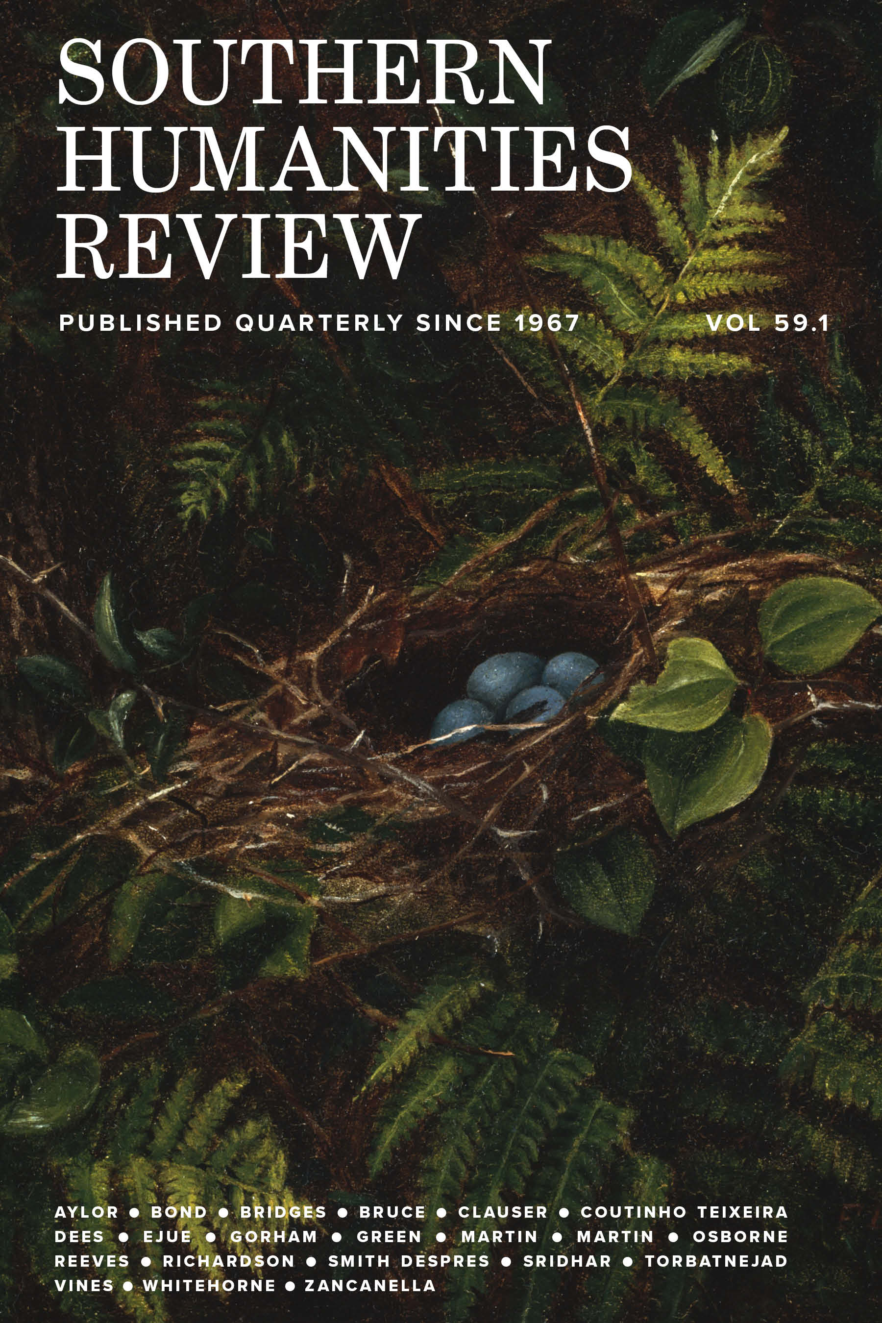 Southern Humanities Review is the literary quarterly published from the Department of English at Auburn University in Auburn, Alabama. Founded in 1967, SHR publishes fiction, poetry, and essays. When Southern Humanities Review first began, our founding editors called for work which was “thoughtfully conceived to enrich the mind and stir the heart.” More than fifty years later, this call remains relevant. While we are located in the American South, we are interested in work from all human communities and variety of perspectives, geographic and otherwise. We are also interested in writers in various stages of their careers, and especially in work from historically underrepresented voices.
