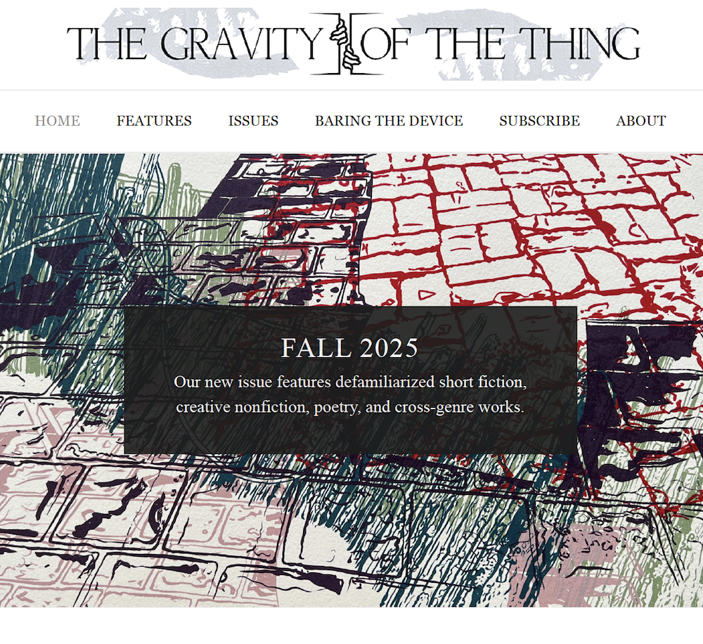 The Gravity of the Thing is an independent publisher of defamiliarized creative writing. Our mission is to publish work that experiments and stranges in pursuit of a renewed sense of discovery.